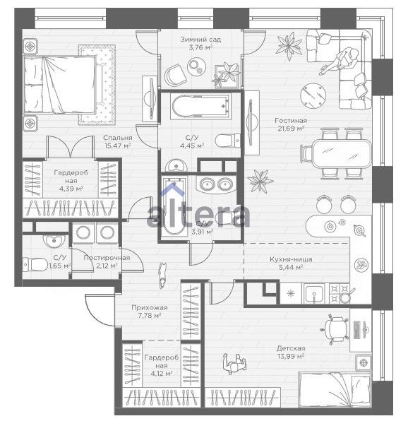 Просторная планировка 88,76 м2: большая кухня - гостиная 27,13 метров, с которой открывается вид на акваторию Казанки; мастер-спальня 15,47м2 со своей гардеробной системой и ванной комнатой; гостевой санузел с постирочной зоной, просторная гардеробная при входе, а также есть возможность сделать зимний сад.