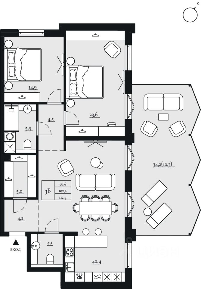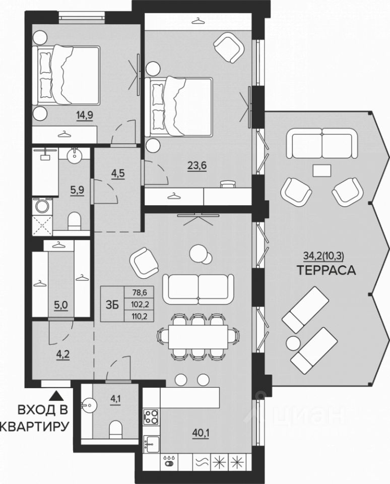 3-комнатная квартира 110,2 м² с террасой в