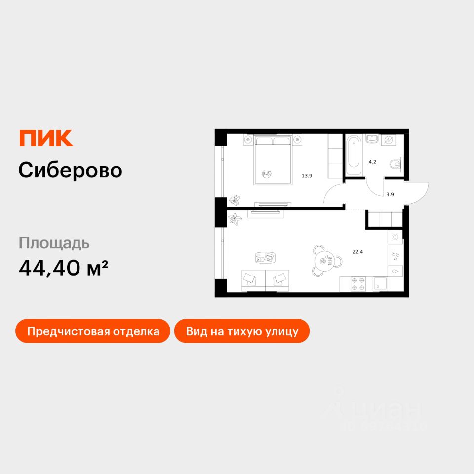 Продаётся 1-комн. квартира площадью 44,4 кв.м на 1 этаже 26 этажного дома (Корпус 3, Секция 5) проекта ПИК Сиберово. Светлый просторный подъезд на уровне земли, функциональная планировка, большие окна, предчистовая отделка.