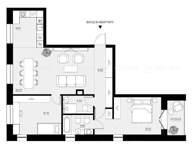 2-комнатная квартира 96.1 м² на 3 этаже в строящемся доме элитного-класса Жилого комплекса "Promenade".