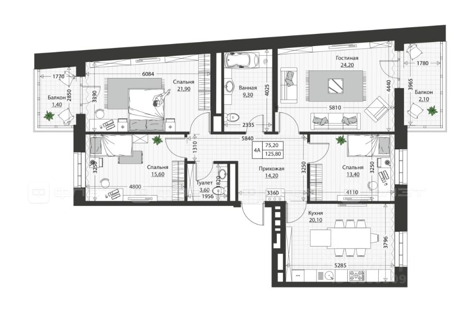 4-комнатная квартира 125.8 м² на 3 этаже в строящемся доме бизнес-класса Жилого комплекса "TRIO".