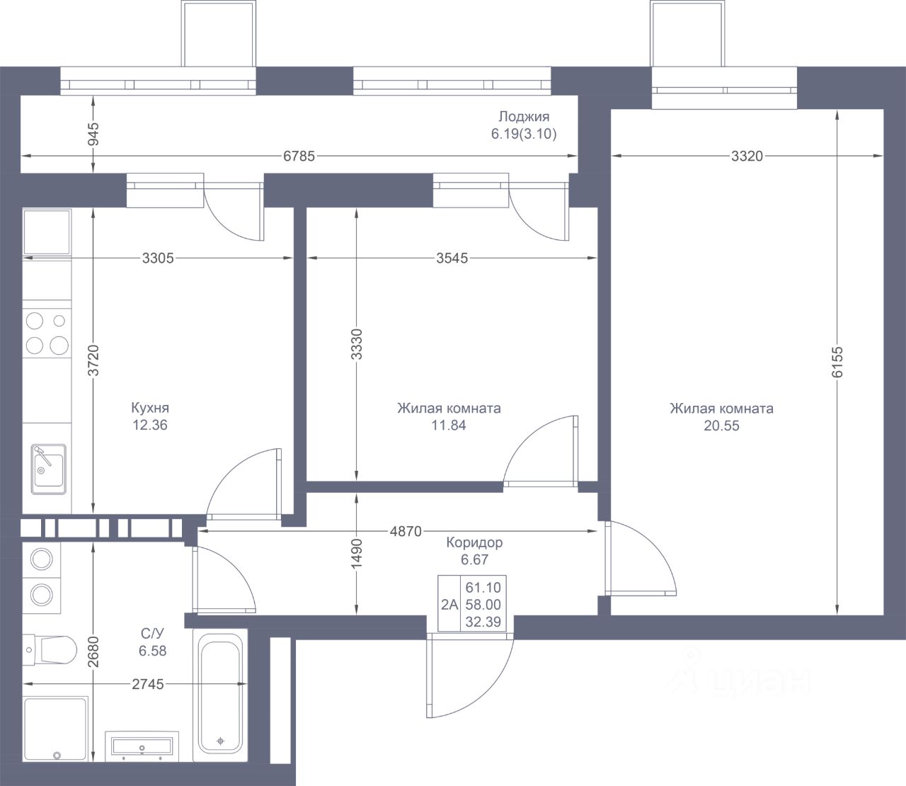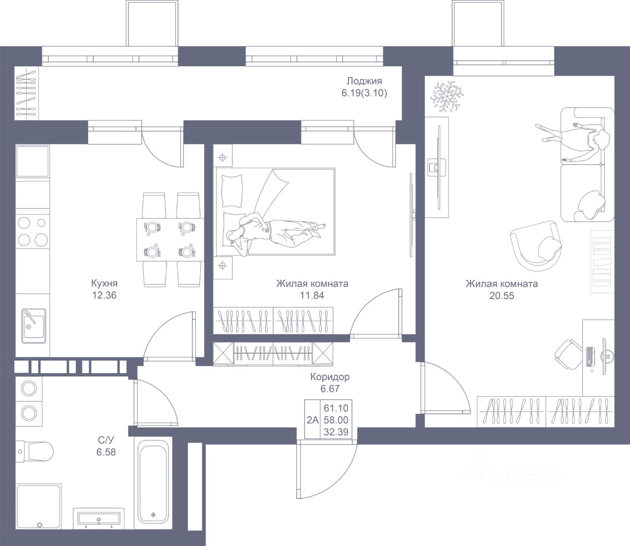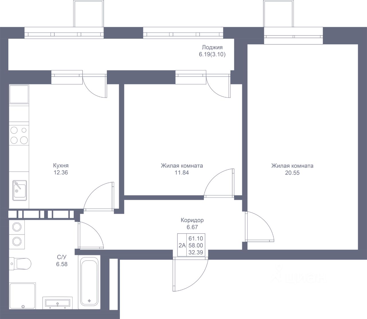 Продается 2-комнатная квартира 131 площадью 61,1 кв.м на 2 этаже 17-ти этажного дома проекта "Мой Ритм" от "Ак Барс Дом". Купить квартиру можно в ипотеку со ставкой от 4,5%.