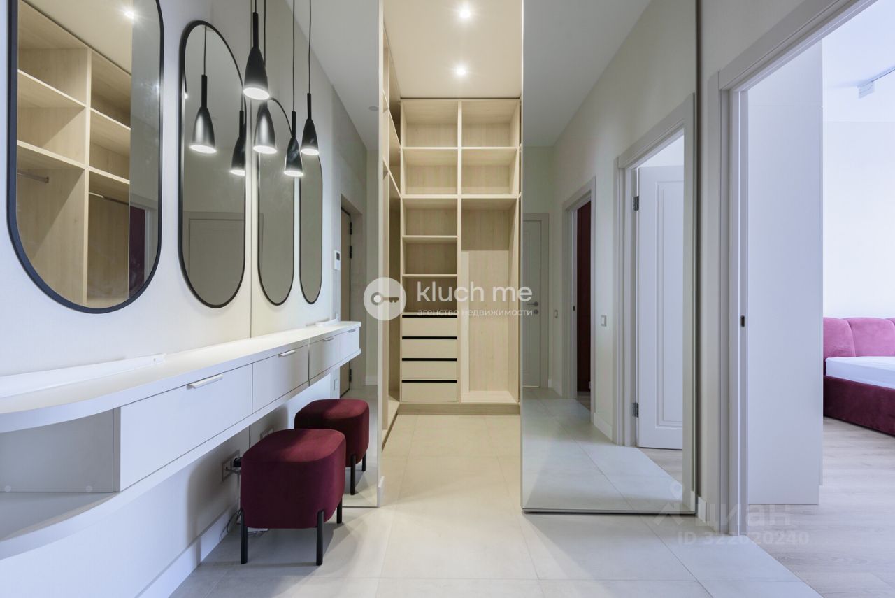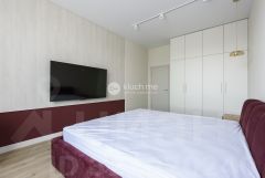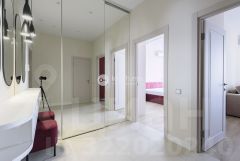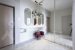 Большой вместительный шкаф в спальной комнате, а также просторная гардеробная, за скрытыми дверями с зеркалом в полный рост.