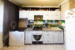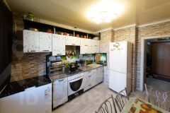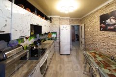 Просторная кухня выходит на лоджию, увеличивая полезное пространство и обеспечивая дополнительное естественное освещение.