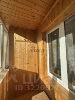 Большой балкон обшит деревом, есть место для хранения, установлены пластиковые окна.
