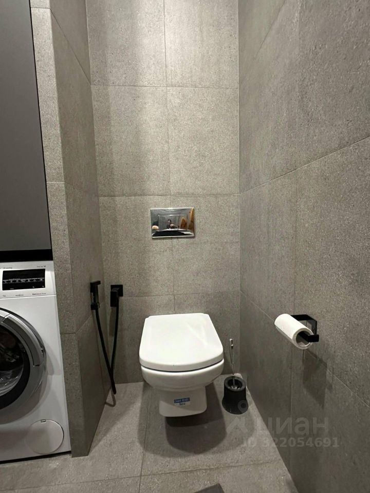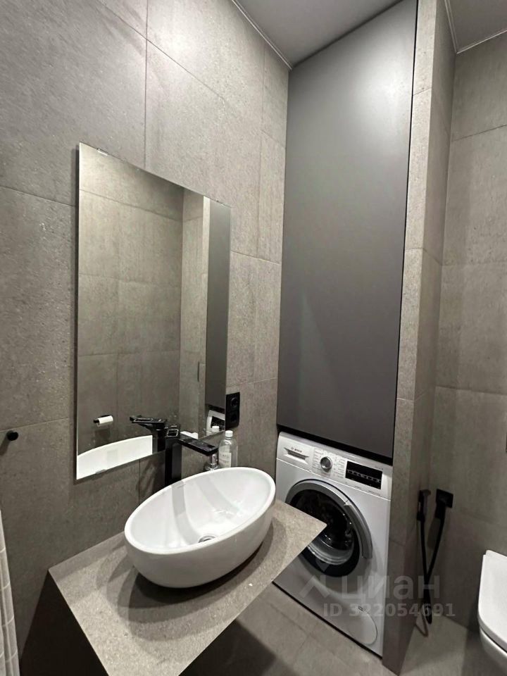 Ванная комната оформлена керамогранитом Kerama marazzi, красивым зеркалом с керамической столешницей и вместительным шкафом, а также большой ванной и стиральной машинкой Bosch. Установлен бойлер и аквастоп.