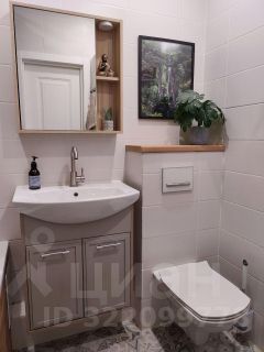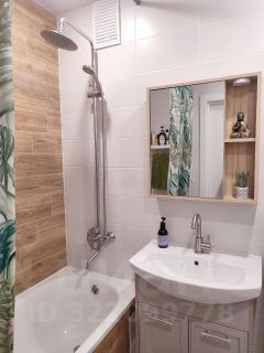Современный санузел с подвесными унитазом и тумбой, ванной с тропическим душем.