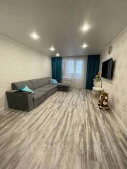 Отделка премиум-уровня: качественный ламинат, стильные обои, натяжные потолки, пластиковые окна, лоджия застеклена и обшита — всё сделано, чтобы ничего не доделывать.