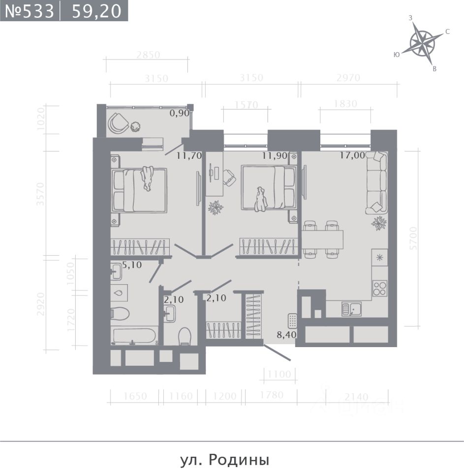 Продаётся 2-комнатная квартира в строящемся доме (Корпус 2), срок сдачи: I-кв. 2029, общей площадью 59.2 кв.м., на 13 этаже.