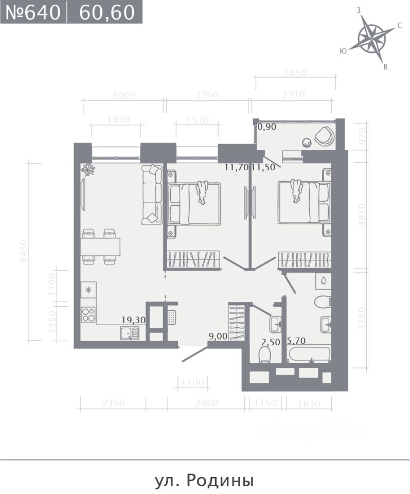 Продаётся 2-комнатная квартира в строящемся доме (Корпус 2), срок сдачи: I-кв. 2029, общей площадью 60.6 кв.м., на 13 этаже.