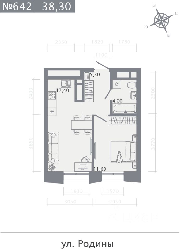 Продаётся 1-комнатная квартира в строящемся доме (Корпус 2), срок сдачи: I-кв. 2029, общей площадью 38.3 кв.м., на 13 этаже.