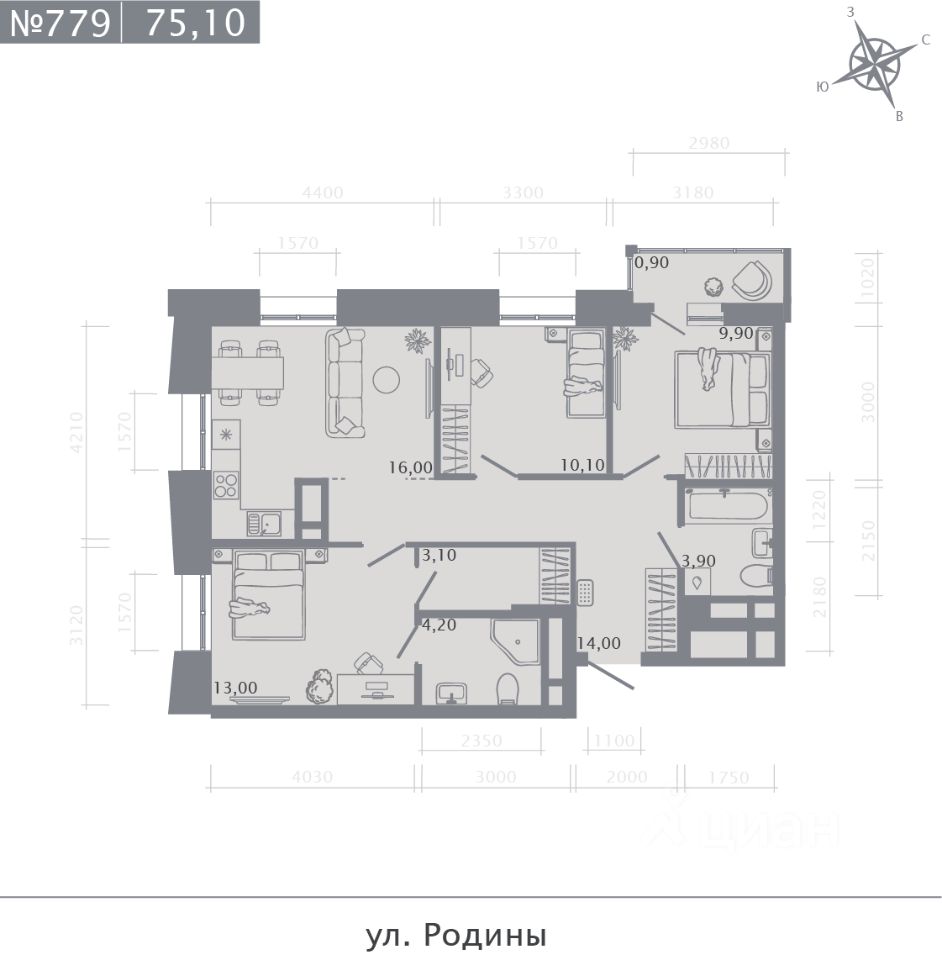 Продаётся 3-комнатная квартира в строящемся доме (Корпус 2), срок сдачи: I-кв. 2029, общей площадью 75.1 кв.м., на 13 этаже.