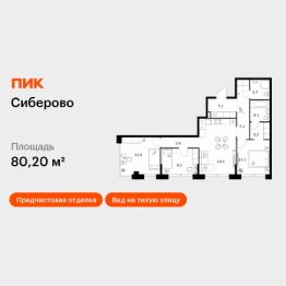 Продаётся 3-комн. квартира площадью 80,2 кв.м на 8 этаже 16 этажного дома (Корпус 3, Секция 4) проекта ПИК Сиберово. Светлый просторный подъезд на уровне земли, функциональная планировка, большие окна, предчистовая отделка.
