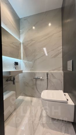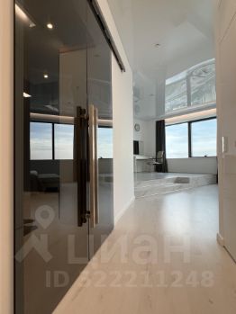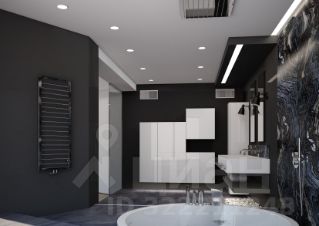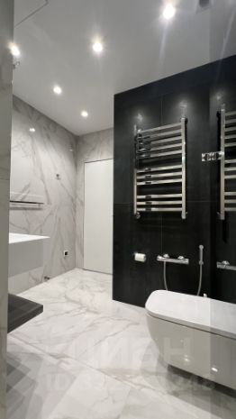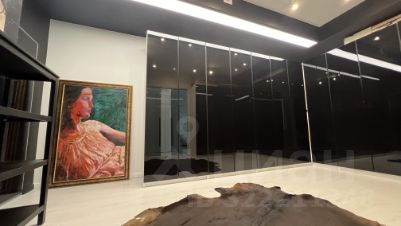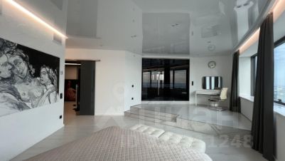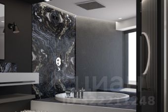 - Мастер-спальня 35 кв.м. с отдельной ванной комнатой 15,5кв.м (большая ванна у панорамного окна с тропическим душем), с отдельным вместительным гардеробом 19,3кв.м. и отдельным санузлом 1,6кв.м. На стене ванной комнаты слэб из натурального мрамора производства Италии. Из спальни в гардероб и ванную комнату установлены раздвижные перегородки, изготовленные из качественного тёмного премиум стекла производства Германии.