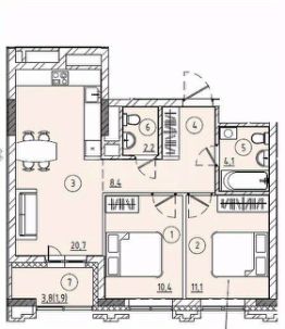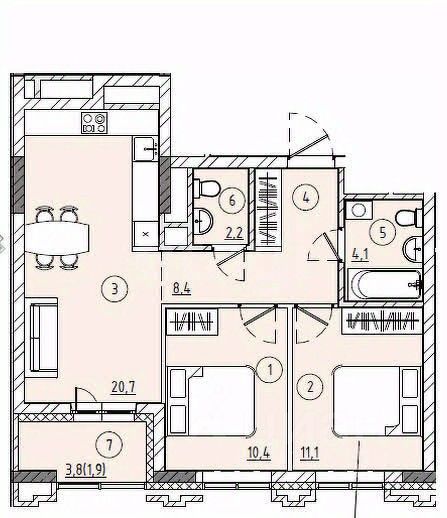 Функциональная планировка: имеются 2 спальные комнаты 12 и 11 м.кв., Кухня- гостиная площадью 21м.кв