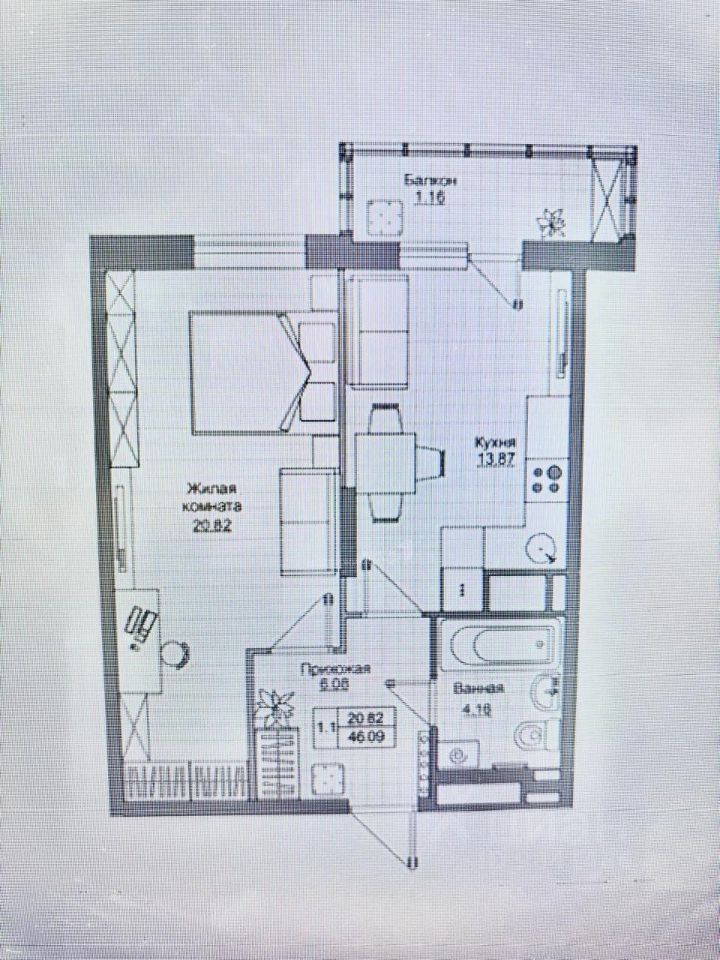 площадь 46.09 квадратных метра - оптимальный размер для комфортной жизни .