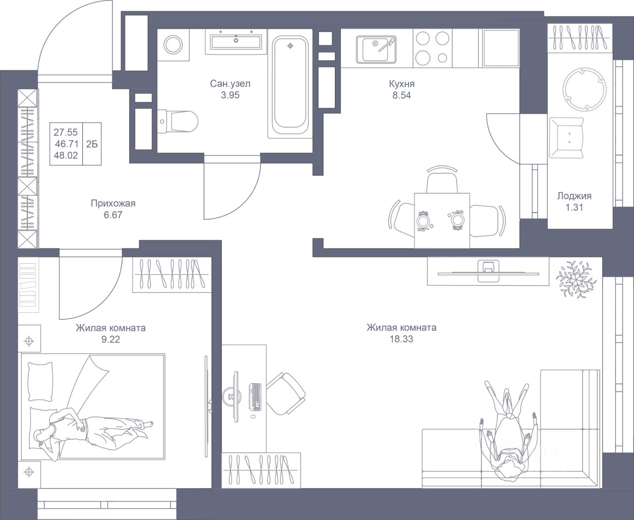 Комфортная 2-комнатная квартира с удачной планировкой. Увеличенная комната в 18,3 кв. м., где можно разместить гостиную или комнату для двоих детей. Отдельная кухня, из которой открывается выход на лоджию. Для хранения вещей в коридоре есть место под шкаф-купе, а удачные пропорции жилых комнат и высокие потолки 2,7 м. позволят выгодно использовать пространство при расстановке мебели.