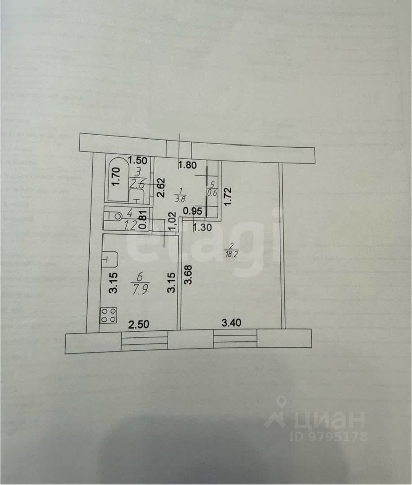 Просторная планировка 34,4 м²: прихожая (3,8 м²), ванная (2,6 м²), с/у (1,2 м²), просторная кухня 7,9 м² и большая комната 18,2 м², которую легко зонировать на спальную и гостевую зоны.
