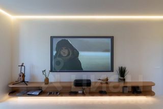 Использовано много не стандартных решений и современных технологий. Такие как - ультракороткофокусный лазерный проектор с АLR экраном ( качественная картинка даже днем ) диагональю 100 дюймов. Встроенная вытяжка в столешницу с электроприводом.