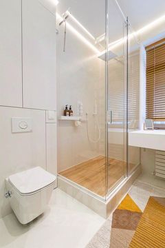 Полы и стены выполнены из микроцемента- очень практичного материала .Мебель на заказ радиальной формы смягчает углы и придает дополнительного уюта.