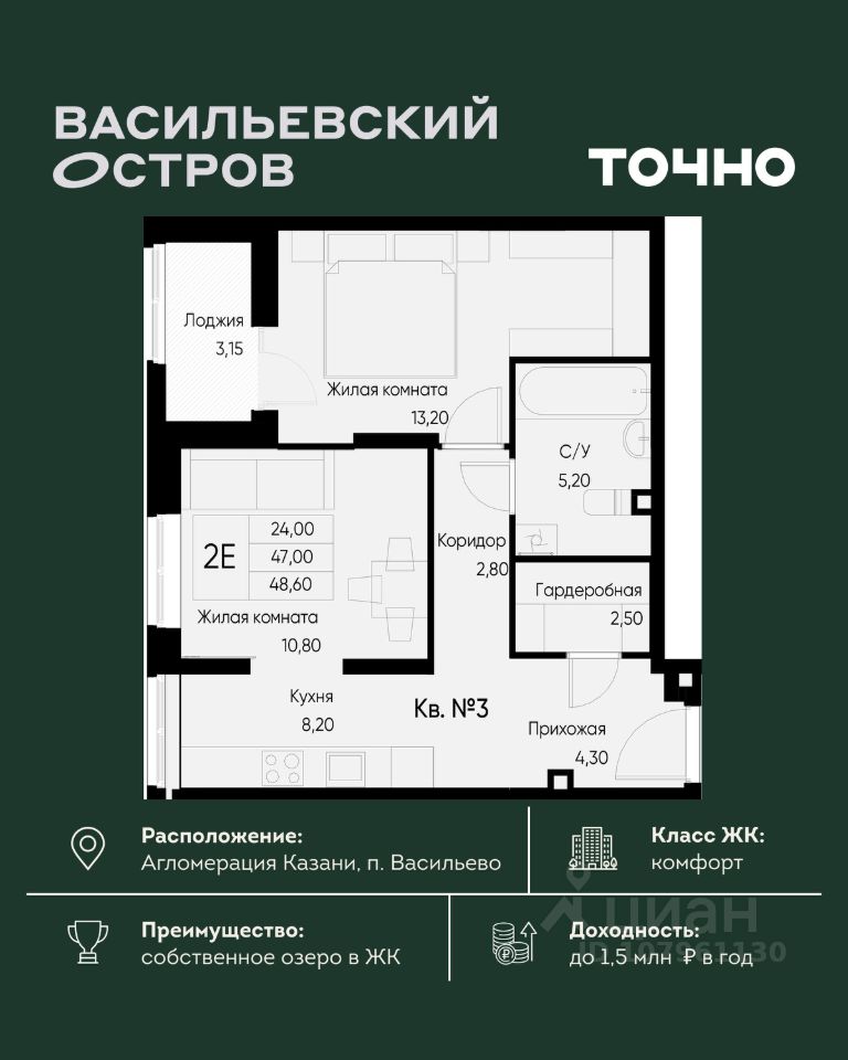 ЖК "Васильевский остров" — масштабный проект ТОЧНО в Казанской агломерации. Просторная территория 88 Га спроектирована для комфортной жизни: озеро с набережной и пляжем, каток, зелёные маршруты. В проекте комплекса — школа на 1 224 места, 2 детских сада на 680 мест, детская и взрослая поликлиники, фитнес-центр с бассейном, термальный комплекс, фермерский рынок, магазины, кафе и рестораны.