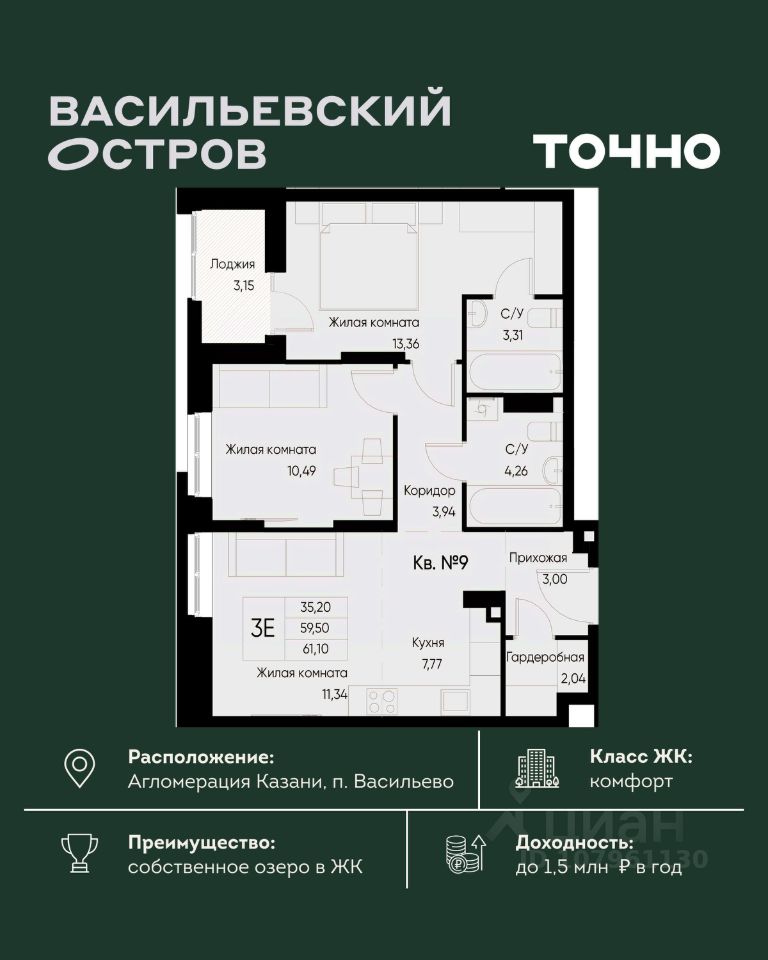 ЖК "Васильевский остров" — масштабный проект ТОЧНО в Казанской агломерации. Просторная территория 88 Га спроектирована для комфортной жизни: озеро с набережной и пляжем, каток, зелёные маршруты. В проекте комплекса — школа на 1 224 места, 2 детских сада на 680 мест, детская и взрослая поликлиники, фитнес-центр с бассейном, термальный комплекс, фермерский рынок, магазины, кафе и рестораны.
