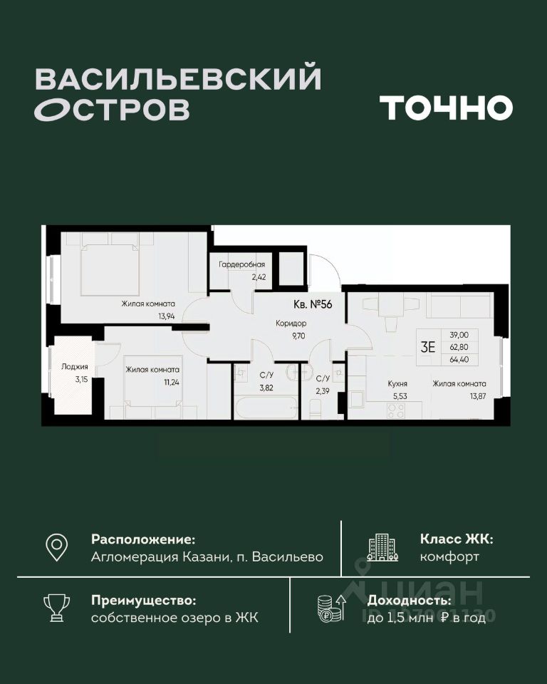 ЖК "Васильевский остров" — масштабный проект ТОЧНО в Казанской агломерации. Просторная территория 88 Га спроектирована для комфортной жизни: озеро с набережной и пляжем, каток, зелёные маршруты. В проекте комплекса — школа на 1 224 места, 2 детских сада на 680 мест, детская и взрослая поликлиники, фитнес-центр с бассейном, термальный комплекс, фермерский рынок, магазины, кафе и рестораны.