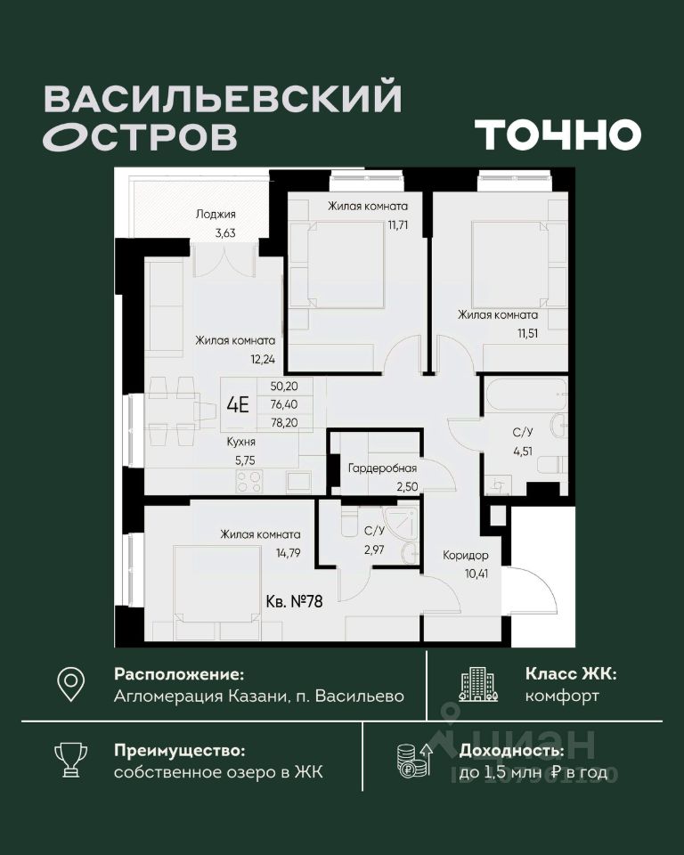 ЖК "Васильевский остров" — масштабный проект ТОЧНО в Казанской агломерации. Просторная территория 88 Га спроектирована для комфортной жизни: озеро с набережной и пляжем, каток, зелёные маршруты. В проекте комплекса — школа на 1 224 места, 2 детских сада на 680 мест, детская и взрослая поликлиники, фитнес-центр с бассейном, термальный комплекс, фермерский рынок, магазины, кафе и рестораны.