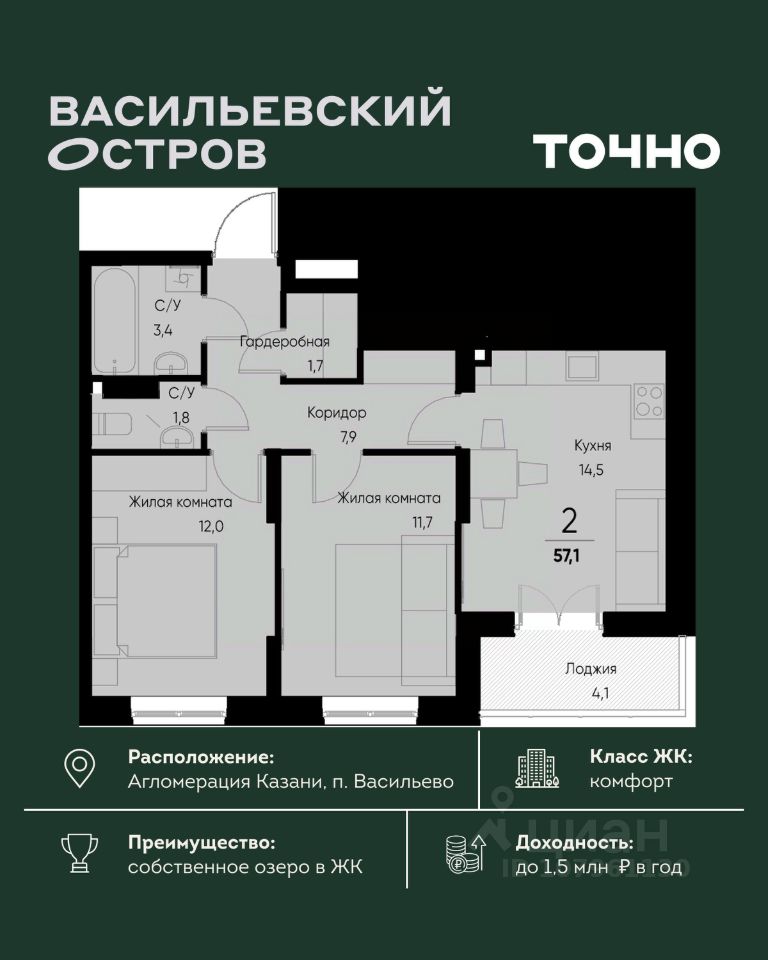 ЖК "Васильевский остров" — масштабный проект ТОЧНО в Казанской агломерации. Просторная территория 88 Га спроектирована для комфортной жизни: озеро с набережной и пляжем, каток, зелёные маршруты. В проекте комплекса — школа на 1 224 места, 2 детских сада на 680 мест, детская и взрослая поликлиники, фитнес-центр с бассейном, термальный комплекс, фермерский рынок, магазины, кафе и рестораны.