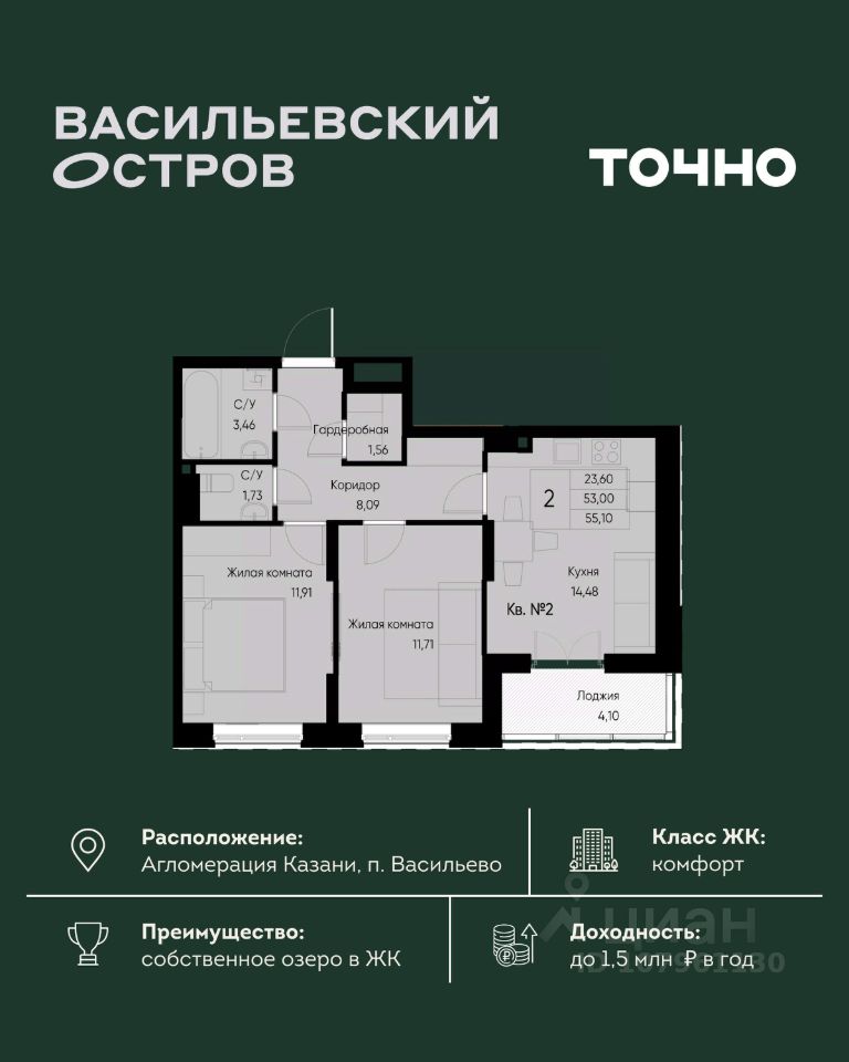 ЖК "Васильевский остров" — масштабный проект ТОЧНО в Казанской агломерации. Просторная территория 88 Га спроектирована для комфортной жизни: озеро с набережной и пляжем, каток, зелёные маршруты. В проекте комплекса — школа на 1 224 места, 2 детских сада на 680 мест, детская и взрослая поликлиники, фитнес-центр с бассейном, термальный комплекс, фермерский рынок, магазины, кафе и рестораны.