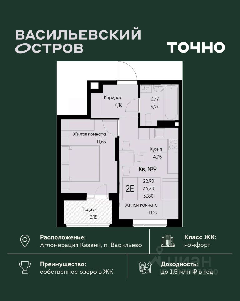 ЖК "Васильевский остров" — масштабный проект ТОЧНО в Казанской агломерации. Просторная территория 88 Га спроектирована для комфортной жизни: озеро с набережной и пляжем, каток, зелёные маршруты. В проекте комплекса — школа на 1 224 места, 2 детских сада на 680 мест, детская и взрослая поликлиники, фитнес-центр с бассейном, термальный комплекс, фермерский рынок, магазины, кафе и рестораны.