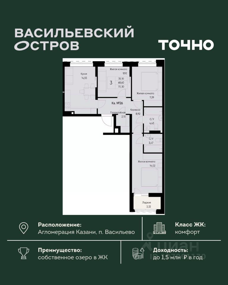 ЖК "Васильевский остров" — масштабный проект ТОЧНО в Казанской агломерации. Просторная территория 88 Га спроектирована для комфортной жизни: озеро с набережной и пляжем, каток, зелёные маршруты. В проекте комплекса — школа на 1 224 места, 2 детских сада на 680 мест, детская и взрослая поликлиники, фитнес-центр с бассейном, термальный комплекс, фермерский рынок, магазины, кафе и рестораны.