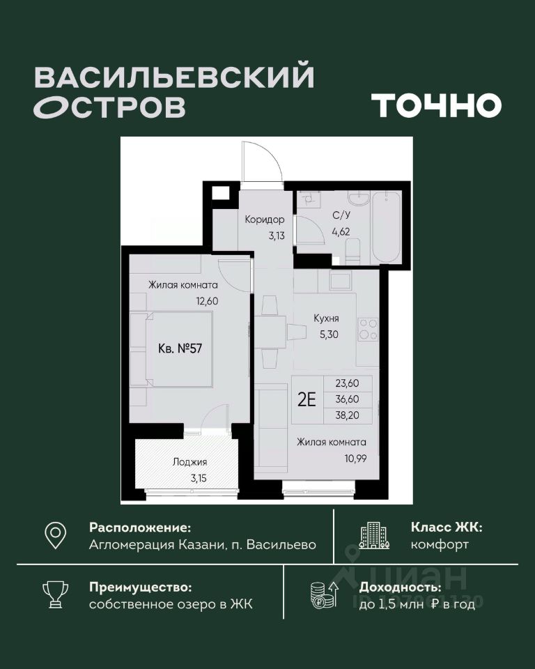 ЖК "Васильевский остров" — масштабный проект ТОЧНО в Казанской агломерации. Просторная территория 88 Га спроектирована для комфортной жизни: озеро с набережной и пляжем, каток, зелёные маршруты. В проекте комплекса — школа на 1 224 места, 2 детских сада на 680 мест, детская и взрослая поликлиники, фитнес-центр с бассейном, термальный комплекс, фермерский рынок, магазины, кафе и рестораны.