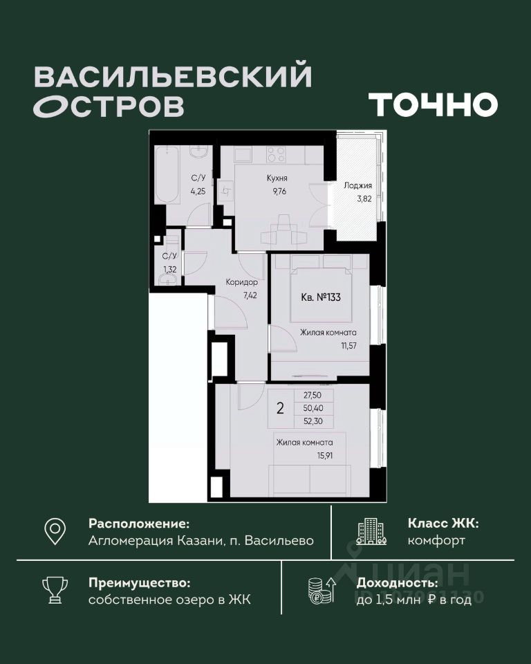ЖК "Васильевский остров" — масштабный проект ТОЧНО в Казанской агломерации. Просторная территория 88 Га спроектирована для комфортной жизни: озеро с набережной и пляжем, каток, зелёные маршруты. В проекте комплекса — школа на 1 224 места, 2 детских сада на 680 мест, детская и взрослая поликлиники, фитнес-центр с бассейном, термальный комплекс, фермерский рынок, магазины, кафе и рестораны.