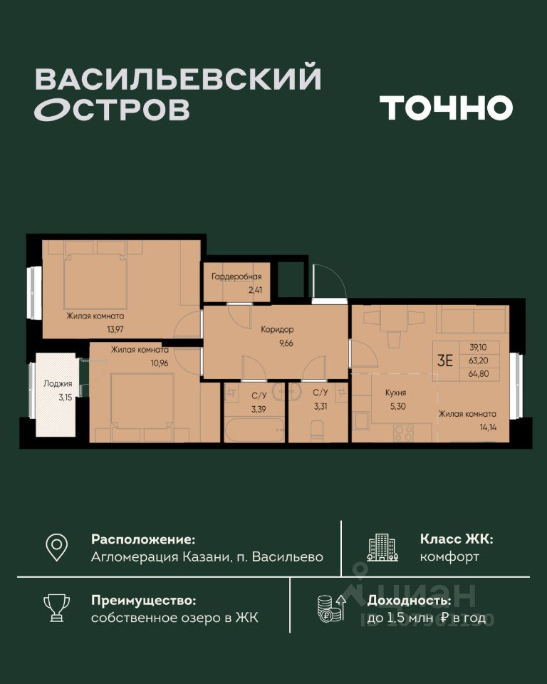 ЖК "Васильевский остров" — масштабный проект ТОЧНО в Казанской агломерации. Просторная территория 88 Га спроектирована для комфортной жизни: озеро с набережной и пляжем, каток, зелёные маршруты. В проекте комплекса — школа на 1 224 места, 2 детских сада на 680 мест, детская и взрослая поликлиники, фитнес-центр с бассейном, термальный комплекс, фермерский рынок, магазины, кафе и рестораны.