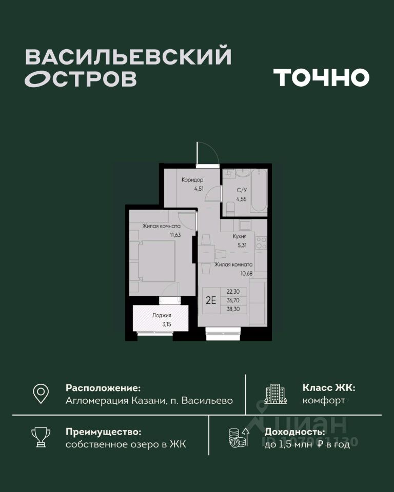 ЖК "Васильевский остров" — масштабный проект ТОЧНО в Казанской агломерации. Просторная территория 88 Га спроектирована для комфортной жизни: озеро с набережной и пляжем, каток, зелёные маршруты. В проекте комплекса — школа на 1 224 места, 2 детских сада на 680 мест, детская и взрослая поликлиники, фитнес-центр с бассейном, термальный комплекс, фермерский рынок, магазины, кафе и рестораны.