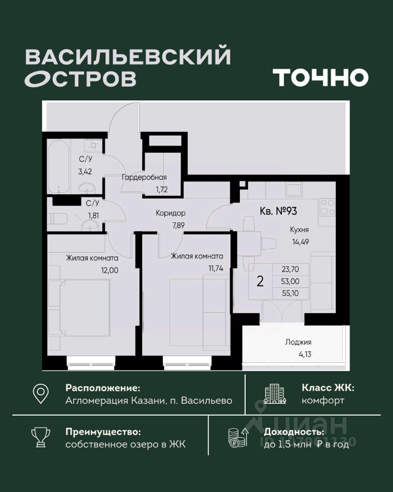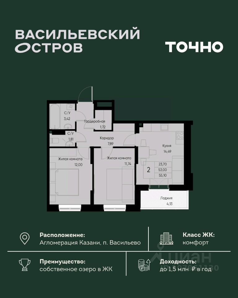 ЖК "Васильевский остров" — масштабный проект ТОЧНО в Казанской агломерации. Просторная территория 88 Га спроектирована для комфортной жизни: озеро с набережной и пляжем, каток, зелёные маршруты. В проекте комплекса — школа на 1 224 места, 2 детских сада на 680 мест, детская и взрослая поликлиники, фитнес-центр с бассейном, термальный комплекс, фермерский рынок, магазины, кафе и рестораны.