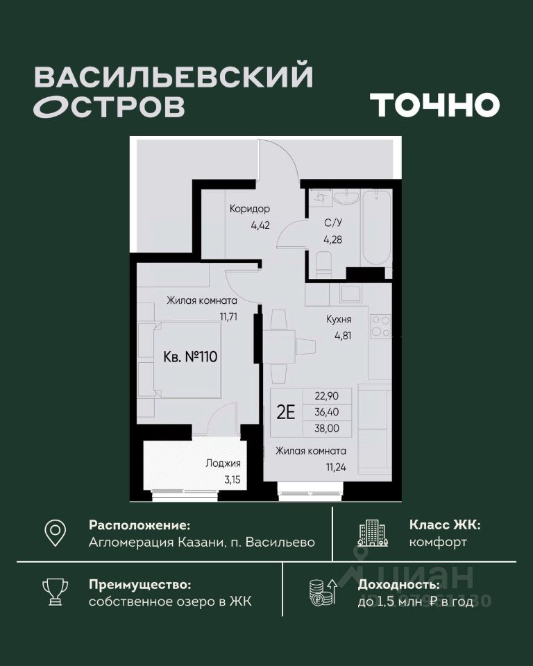 ЖК "Васильевский остров" — масштабный проект ТОЧНО в Казанской агломерации. Просторная территория 88 Га спроектирована для комфортной жизни: озеро с набережной и пляжем, каток, зелёные маршруты. В проекте комплекса — школа на 1 224 места, 2 детских сада на 680 мест, детская и взрослая поликлиники, фитнес-центр с бассейном, термальный комплекс, фермерский рынок, магазины, кафе и рестораны.