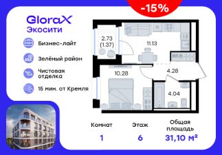 Продается 1-комн. квартира на 6-м этаже в строящемся проекте GloraX Экосити. Общая площадь лота составляет 31,10 кв. м, из которых 10,28 кв. м отведено под жилую и 11,13 кв. м под кухонную зону. Номер квартиры - 102