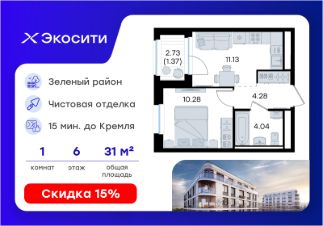 Продается 1-комн. квартира на 6-м этаже в строящемся проекте Экосити. Общая площадь лота составляет 31,10 кв. м, из которых 10,28 кв. м отведено под жилую и 11,13 кв. м под кухонную зону. Номер квартиры - 102