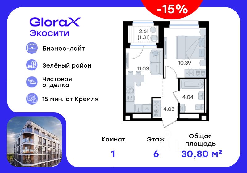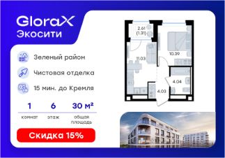 Продается 1-комн. квартира на 6-м этаже в строящемся проекте GloraX Экосити. Общая площадь лота составляет 30,80 кв. м, из которых 10,39 кв. м отведено под жилую и 11,03 кв. м под кухонную зону. Номер квартиры - 215