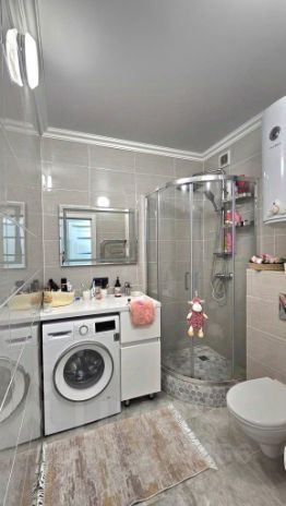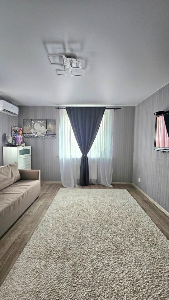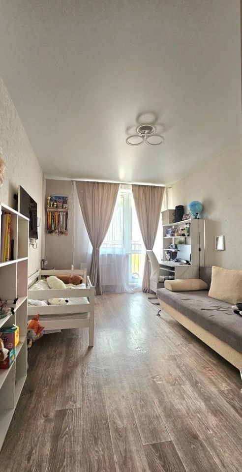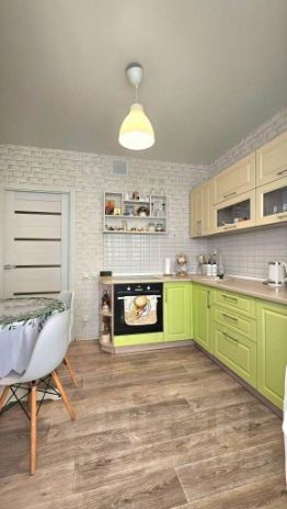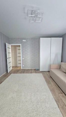 В квартире выполнен качественный ремонт в cвeтлыx тонах, из современных материалов (натяжные потoлки, cветлыe обoи, ламинат, плитка в ванной комнате).