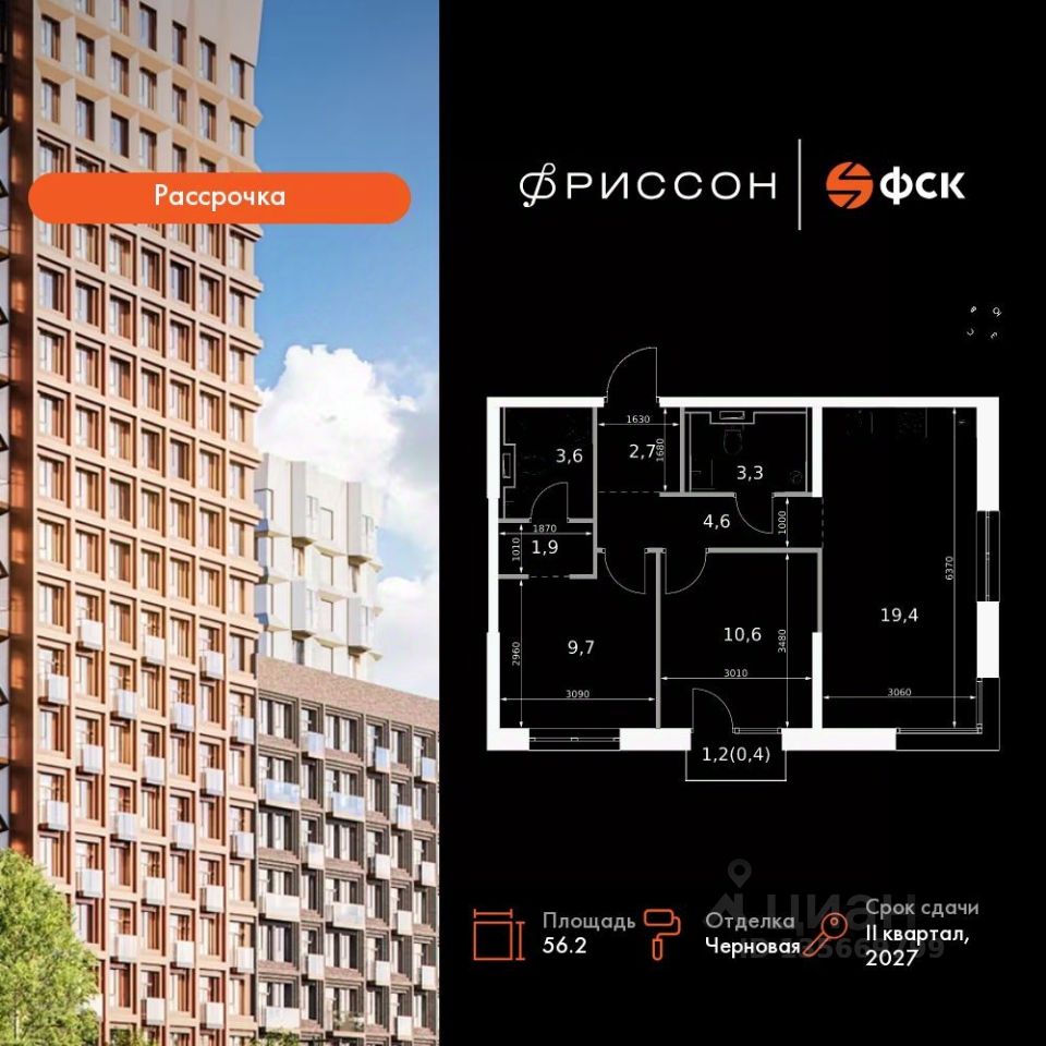 Продаётся 2-к квартира номер 17 общей площадью 56.2 кв.м. на 5-м этаже 20 этажного дома. Отделка Whitebox. Цена с учётом скидки!