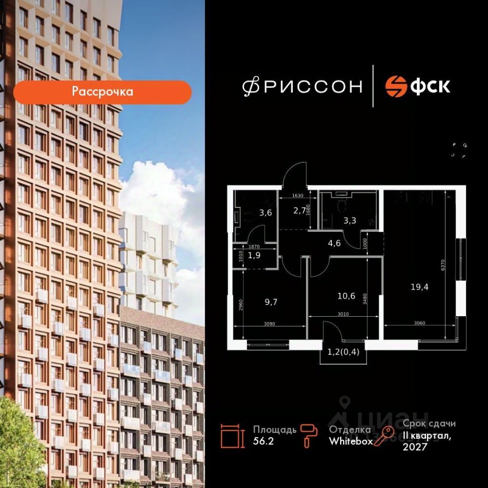 Продаётся 2-к квартира номер 17 общей площадью 56.2 кв.м. на 5-м этаже 20 этажного здания. Отделка Whitebox. Цена с учётом скидки.