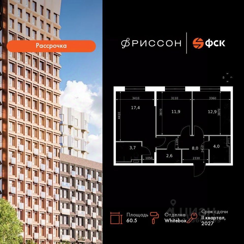 Продаётся 2-к квартира номер 241 общей площадью 60.5 кв.м. на 12-м этаже 19 этажного здания. Отделка Whitebox. Цена с учётом скидки.
