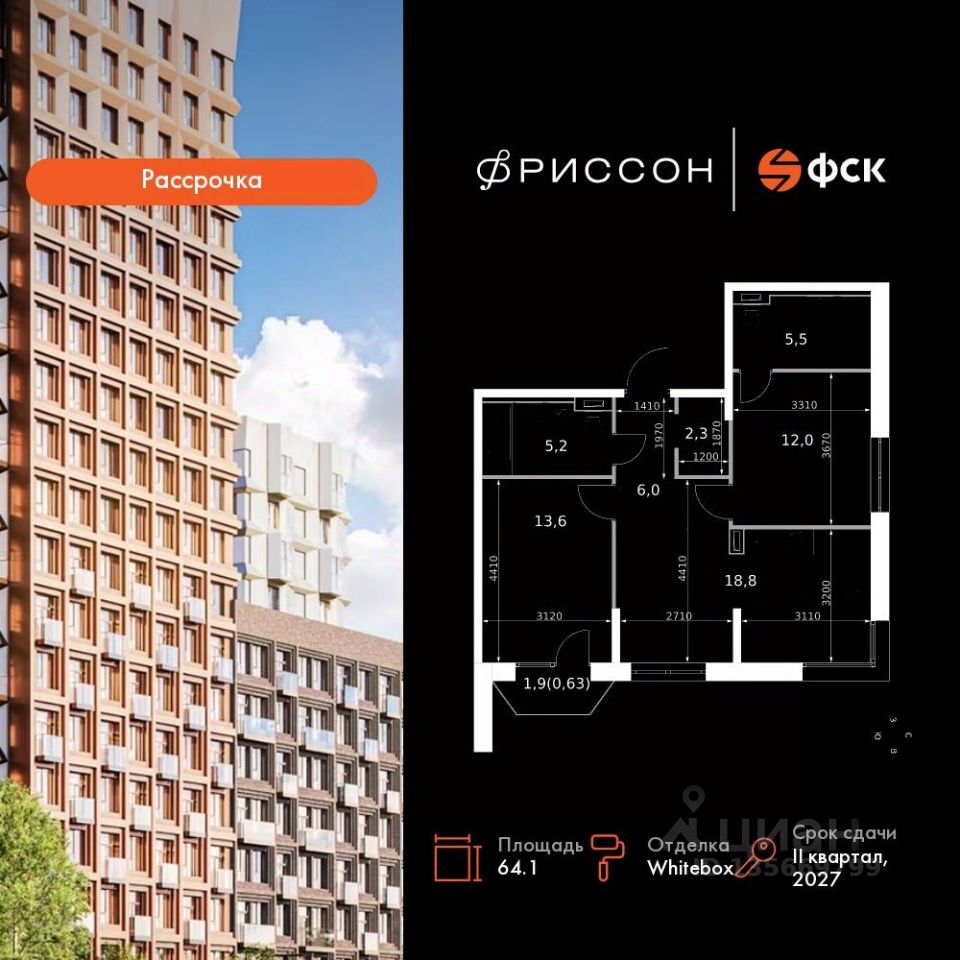 Продаётся 3-к квартира номер 174 общей площадью 64.1 кв.м. на 3-м этаже 19 этажного здания. Отделка Whitebox. Цена с учётом скидки.