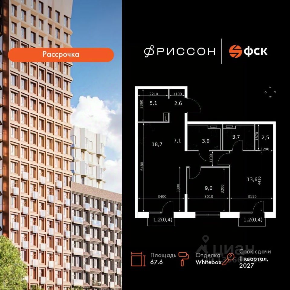 Продаётся 3-к квартира номер 184 общей площадью 67.6 кв.м. на 4-м этаже 19 этажного здания. Отделка Whitebox. Цена с учётом скидки.