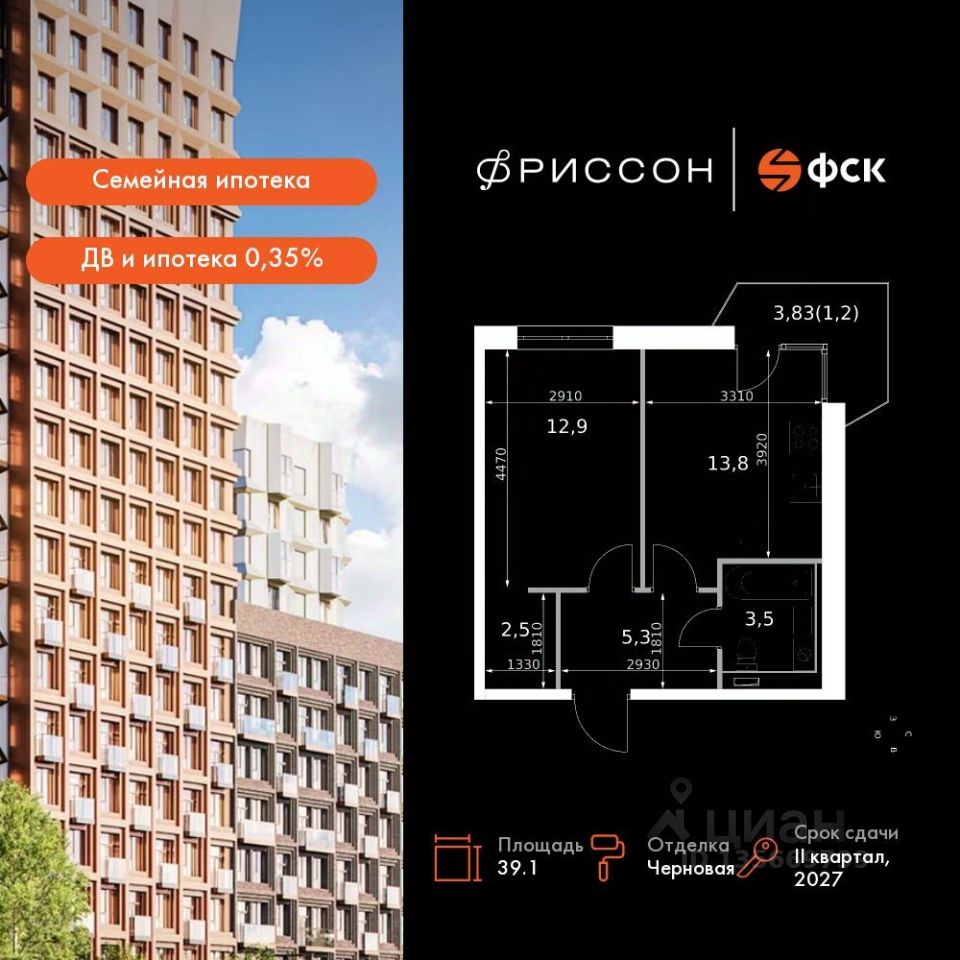 Продаётся 1-к квартира номер 187 общей площадью 39.1 кв.м. на 5-м этаже 19 этажного дома. Отделка Whitebox. Цена с учётом скидки!