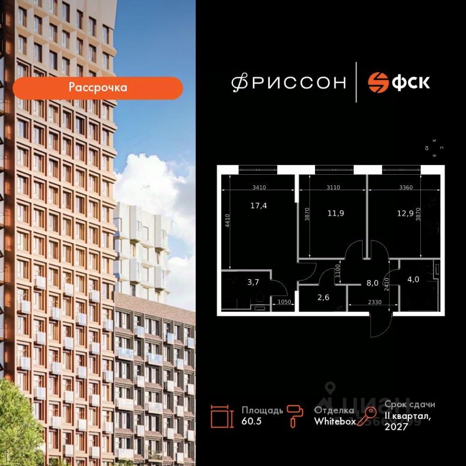 Продаётся 2-к квартира номер 227 общей площадью 60.5 кв.м. на 10-м этаже 19 этажного здания. Отделка Whitebox. Цена с учётом скидки.