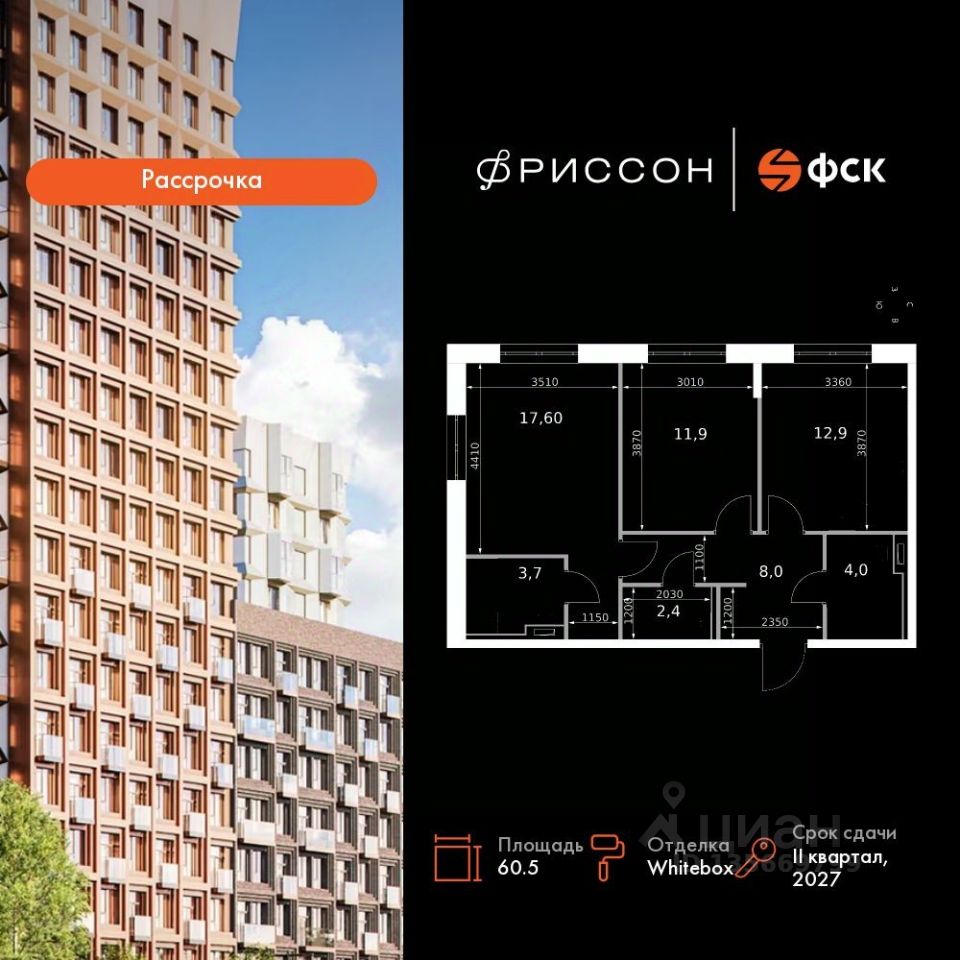 Продаётся 2-к квартира номер 296 общей площадью 60.5 кв.м. на 3-м этаже 8 этажного здания. Отделка Whitebox. Цена с учётом скидки.